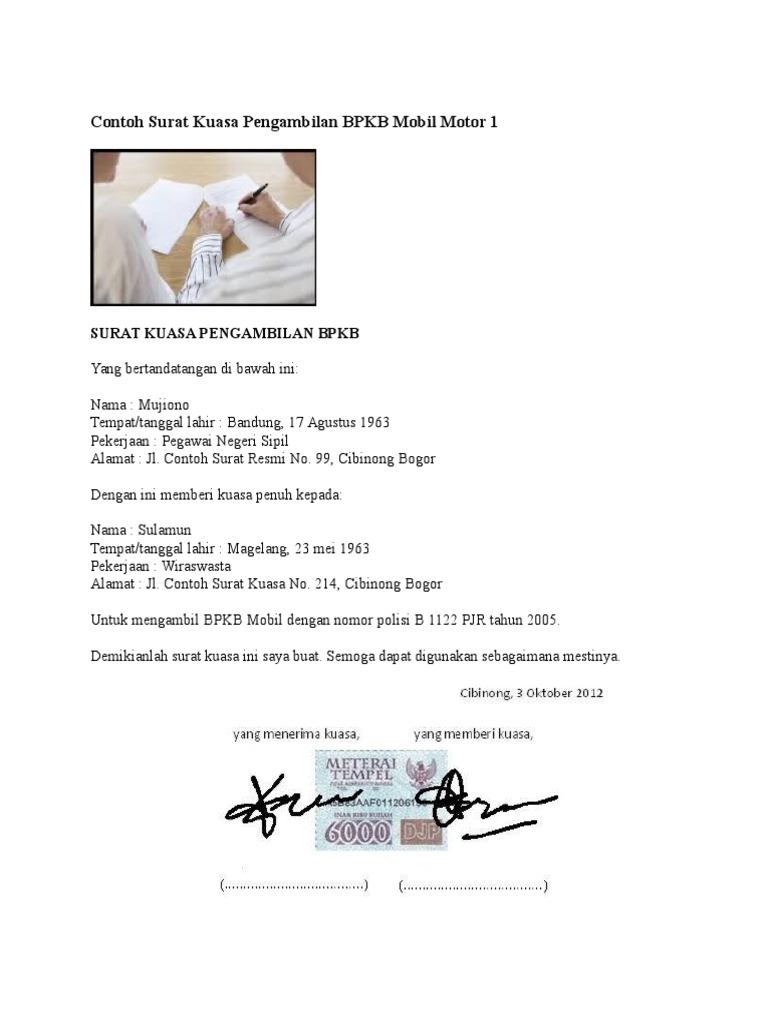 Begini, secara umum surat kuasa adalah sebuah surat yang berisi pernyataan bahwa kita memberikan kuasa atau wewenang kepada seseorang secara resmi untuk. Berikut ini adalah contoh surat kuasa pemgambilan bpkb yang dapat kalian download dan modifikasi sesuai kebutuhan dan. File tersebut tentu akan memudahkan anda karena mengonsep surat kuasa tentunya akan menggunakan microsoft office. Biasanya petugas di bagian pengambilan bpkb mensyaratkan membawa ktp asli, stnk asli dan juga surat kuasa ( jika yang mengambil adalah bukan pemilik kendaraan ). Jika anda ingin mengurus pembayaran dan pengurusan perpanjang stnk tahunan, anda hanya perlu membawa stnk dan ktp pemilik saja.