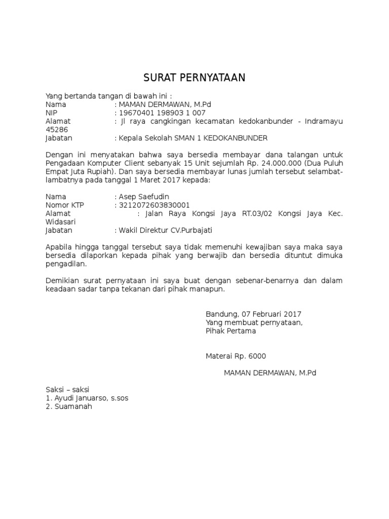 55 contoh surat pernyataan kesanggupan yang baik. Demi menjamin seseorang tersebut melunasinya tepat waktu dan diharapkan tidak mengingkari janji, ada baiknya dibuatkan surat pernyataan seperti di bawah ini. Contoh surat pernyataan kali ini adalah sebuah format surat pernyataan yang menyatakan kesanggupan membayar hutang oleh pihak peminjam kepa. Misalnya surat pernyataan hutang, surat pernyataan kesanggupan, surat pernyataan belum menikah dan lain sebagainya. Firman, se, m.si jabatan : Surat pernyataan adalah surat yang dibuat oleh seseorang yang berisi pernyataan dirinya materai dalam surat pernyataan berfungsi untuk menambah keabsahan berkas atau surat dan terikat hukum. Contoh surat pernyataan hutang yang benar. Contoh surat pernyataan kesanggupan membayar biaya kuliah atau biaya pendidikan. Surat pernyataan merupakan salah satu surat yang umum digunakan untuk berbagai macam hal. Nah, berikut ini kami bagikan contoh surat kesanggupan membayar hutang yang baik, yang bisa anda jadikan referensi Surat pernyataan hutang ini digunakan sebagai kekuatan hukum atas terjadinya utang piutang di antara kedua belah pihak. Di bawah ini kami sudah menyiapkan beberapa contoh dari surat pernyataan kesanggupan yang bisa anda jadikan sebagai bahan referensi ketika jika ternyata saya telat membayar hutang yang artinya membayarnya di atas tanggal 5, maka saya bersedia untuk menerima denda sebesar 5% dari. Dalam hal ini perlu diketahui bahwa surat keterangan adalah.