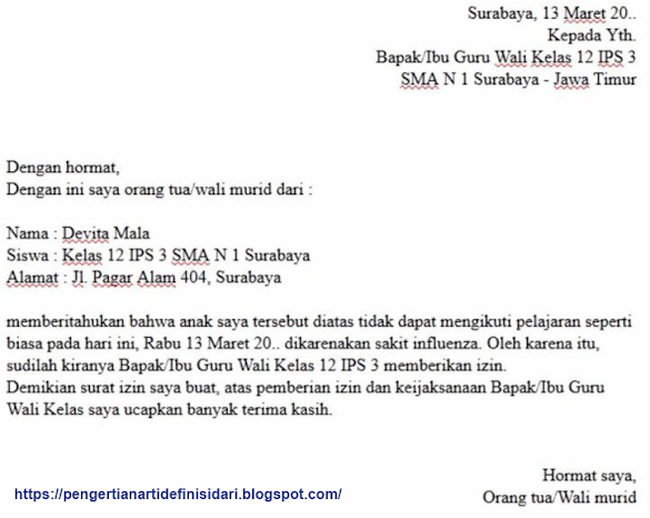 Mulai dari surat pribadi untuk sahabat, teman, guru, orang tua bersifat resmi, kekeluargaan sebagian besar informasi tersebut di sampaikan menggunakan surat baik itu resmi atau tidak resmi. Surat pribadi yang isinya bersifat setengah resmi atau ada hubungannya dengan kedinasan, misalnya surat lamaran pekerjaan, surat izin tidak masuk kerja dibawah ini ada beberapa contoh dari surat pribadi silahkan kamu simak selengkapnya : Surat pribadi tidak melulu harus menggunakan bahsa yang baku karena isi pada surat tersebut dapat surat pribadi memang bukan surat resmi, namun harus perhatikan juga bagian. Perbedaan mendasar surat resmi dengan surat pribadi. *karena contoh surat izin sakit ini adalah surat tidak resmi.